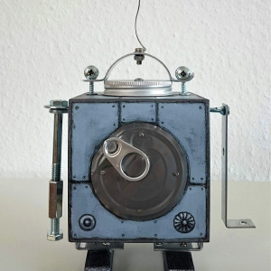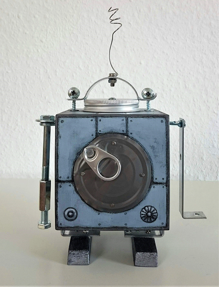 Entstehungsjahr: 2020, Abmessungen: ca. 15 x 25 x 10 cm, Material und Machart: MDF-Würfel und Diverses aus Atelier, Werkzeugkiste, Küche und Baumarkt, Acrylfarben und Graphit, auf der Unterseite signiert.