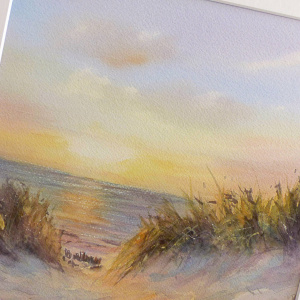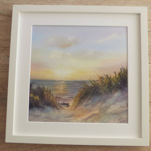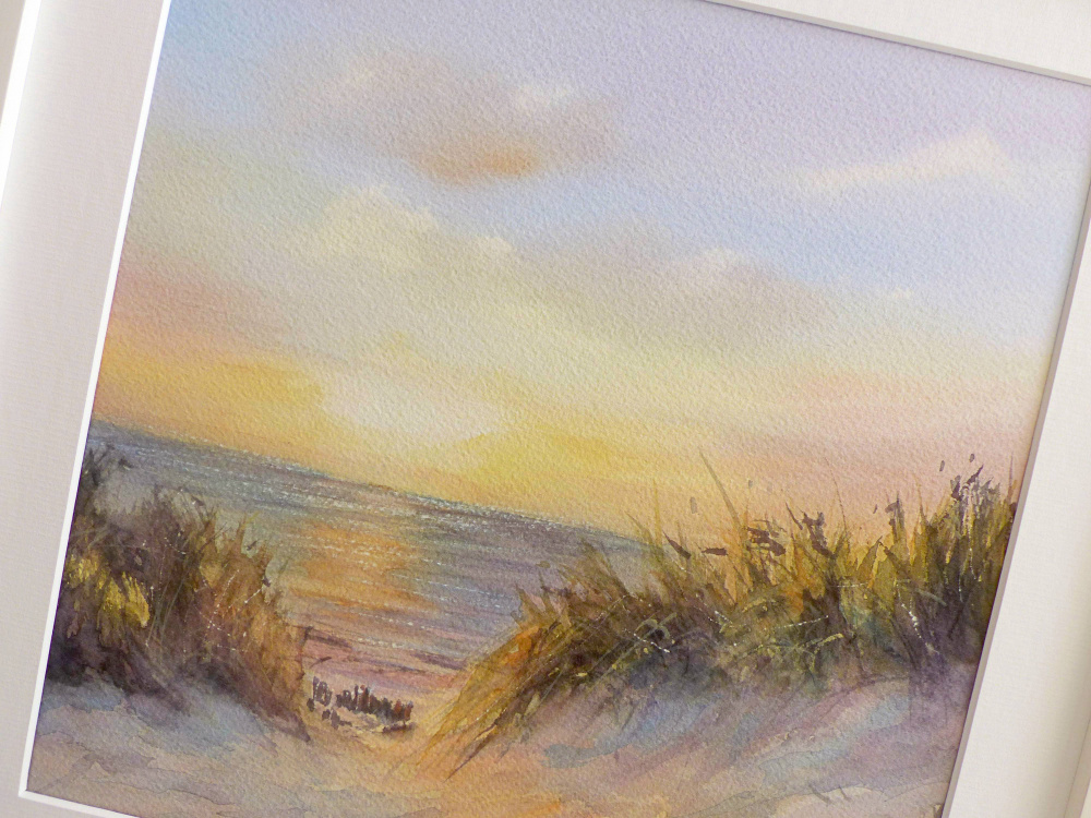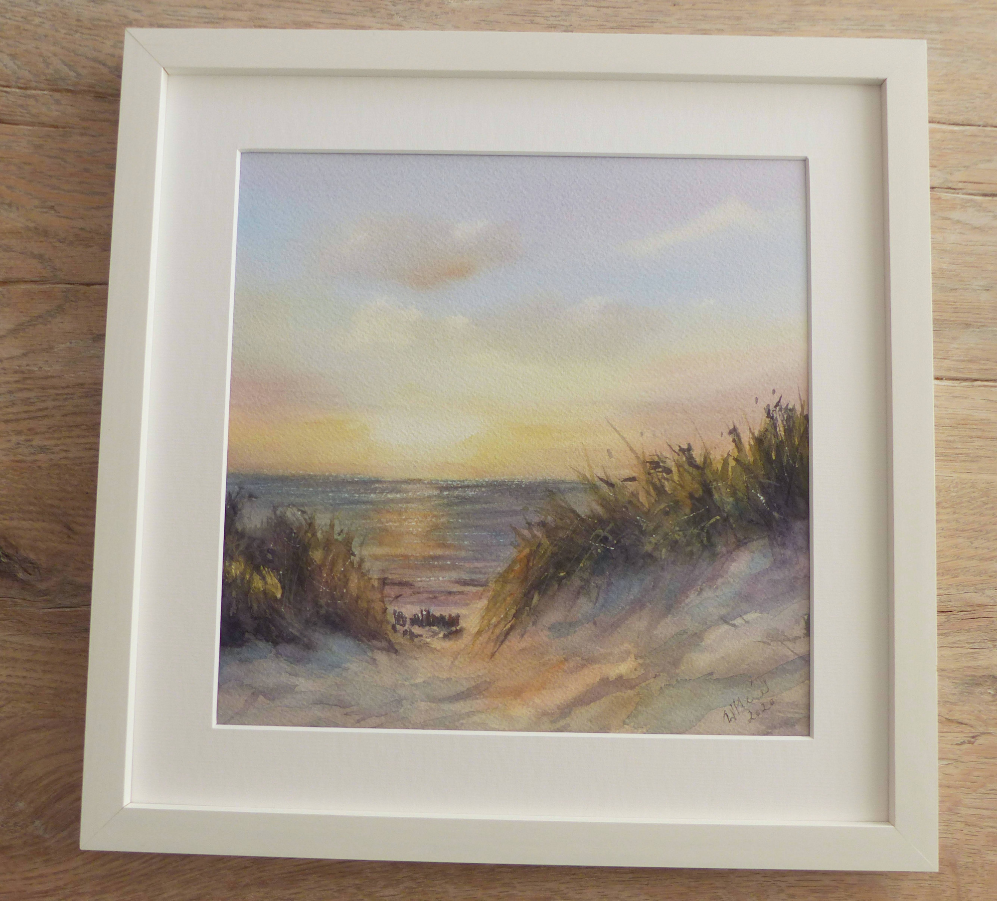Sunset Abmessungen (BxHxT): 30 x 30 x 2 cm (weißer eckiger Holzrahmen) Entstehungsjahr: 2020 Material und Machart: Aquarell Meer-Urlaub für die Sinne oder so schön ist es an der See... Wiebke Meier wiebkemeier.de